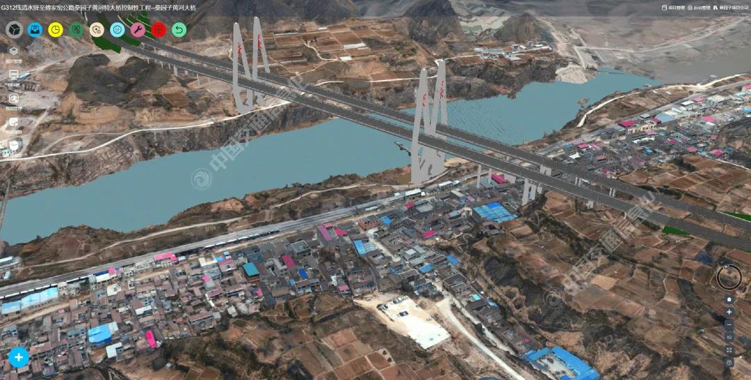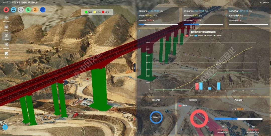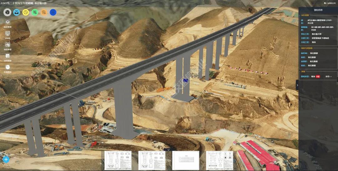 基于对以上关键技术的研究,本文开发BIM+GIS可视化管理平台,完美地将BIM与GIS结合,利用倾斜摄影技术搭建三维场景,结合传统二维地形,实现多维场景一体化展示。首先,通过BIM设计软件建立项目全线构造物设计模型,模型中承载构造物几何尺寸、材料材质、空间位置关系等信息,然后将大体量模型在地理信息系统中与地形影像、三维场景进行数据转化和GIS处理,发布至浏览器中实现模型信息、地理场景信息、施工业务数据的深度融合,最后开发基础地理系统数据库、BIM数据库、业务系统数据库,实现各业务数据集成,通过软件集成与开发,实现在G341线二十里沟至车路崾蚬公路建设项目中的应用。BIM+GIS可视化管理项目应用如图5所示。