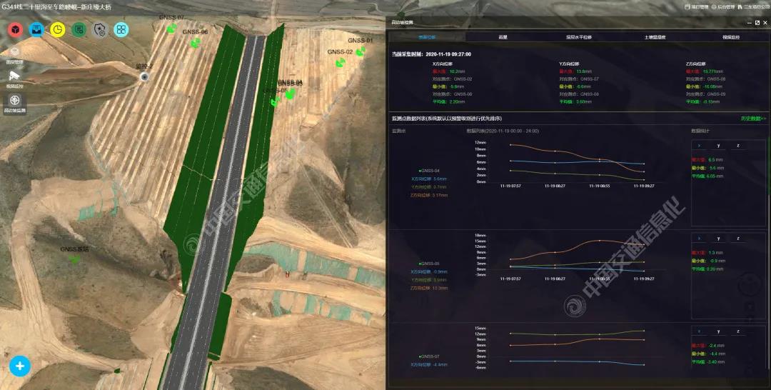 质量安全包括人员、机械、材料等施工过程控制和实时安全监控,为项目各参与方提供施工数据监测、分析统计及安全措施,不断提升建设质量,切实做到施工过程可控,落实安全防范。质量管理中实现材料检测,试验检测实时数据上传、分析、查询,控制自检、巡检、报检、整改业务流程。支持施工人员在隧道模型中的定位检测,有害气体检测,实时视频监控。结合模型,倾斜摄影和传感器定位,实现高边坡设备检测数据展示。质量管控与边坡检测如图9所示。